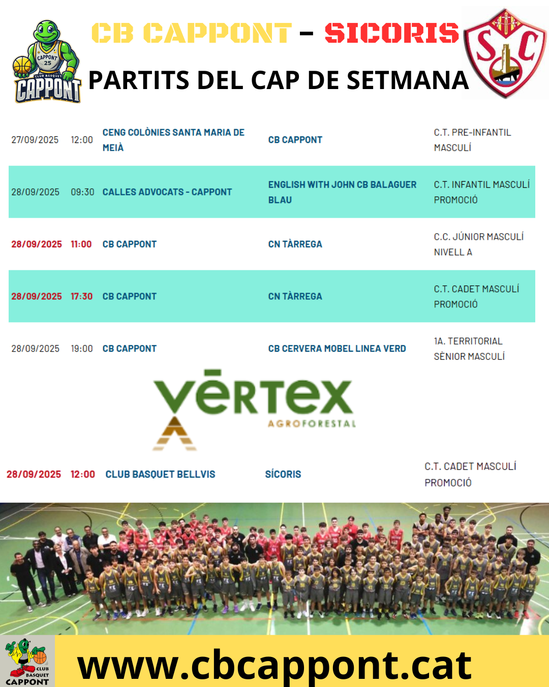 Avui comença la temporada 2025-26 amb el primer partit de l’equip Pre-Infantil del CB Cappont a Artesa de Segre. Estrenarem equipació del 25è aniversari gràcies al patrocini de Vèrtex Agroforestal. Tenim per davant una temporada plena d’emoció, esport i sorpreses per celebrar aquests 25 anys Educant amb l’Esport!